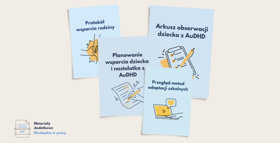 W kursie otrzymasz nie tylko nagrania lekcji, ale też zestaw praktycznych materiałów m.in.: arkusz obserwacji, wzór wywiadu, planowanie wsparcia, protokół dla rodziny, gotowe adaptacje szkolne i strategie pracy z funkcjami wykonawczymi oraz komunikacją. To narzędzia, które możesz wykorzystać od razu w gabinecie, klasie czy poradni.