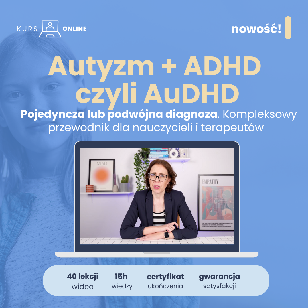 Na każde z tych pytań znajdziesz odpowiedź w kursie „Autyzm + ADHD czyli AuDHD. Pojedyncza lub podwójna diagnoza. Kompleksowy przewodnik dla nauczycieli i terapeutów” – jedynym tak kompleksowym programie w Polsce!