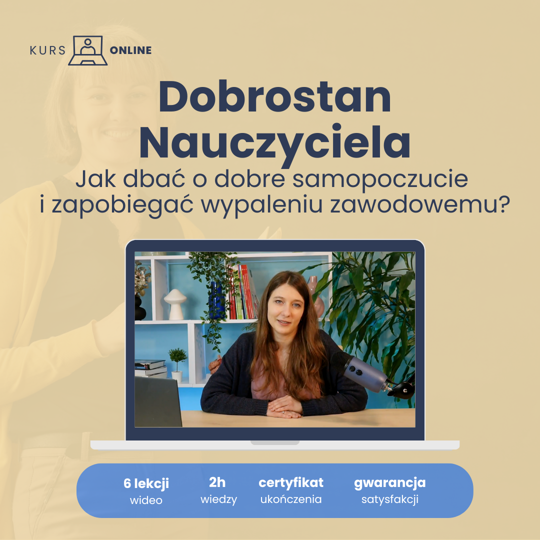 Kurs „Dobrostan nauczyciela – jak dbać o dobre samopoczucie i zapobiegać wypaleniu zawodowemu” powstał z myślą o osobach, które każdego dnia wspierają innych – uczniów, rodziców, współpracowników i coraz częściej czują, że same potrzebują wsparcia, zatrzymania i oddechu.